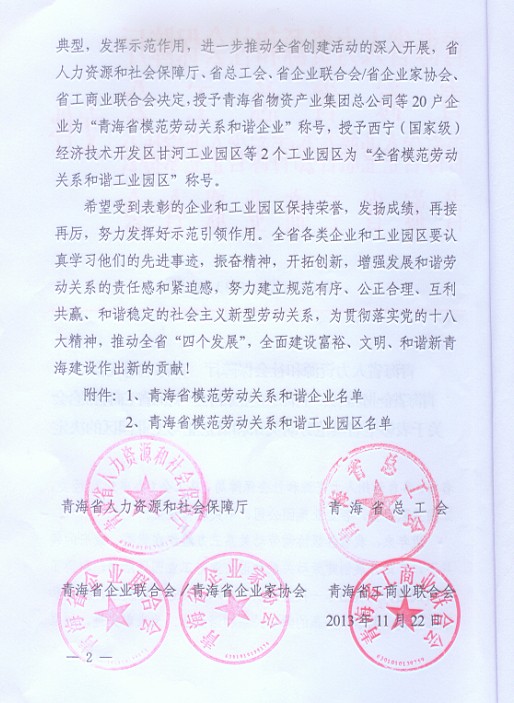 青海省物產集團總公司榮獲“青海省模范勞動關系和諧企業”稱號